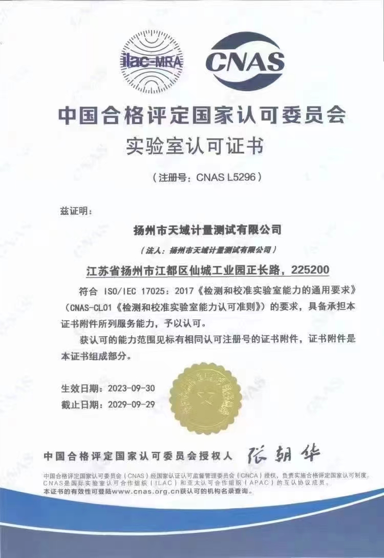 揚州市天域計量測試有限公司,坐落在交通便利的揚州市江都區仙城工業園,成立于2010年10月,2011年11月正式獲取中國合格評定國家認可委員會認可(授權),注冊號:CNAS L5296。近幾年的發展,實驗室已具備了較大規模,并形成了集計量器具檢測,計量技術咨詢和計量器具銷售為一體的專業化技術機構,客戶覆蓋蘇南、蘇北、和浙江,安徽部分地區,客戶群總量達到了上千家企事業單位。實驗室建立健全了一套較為完整的內外部質量管理體系,至今未發生糾紛和客戶投訴事件。